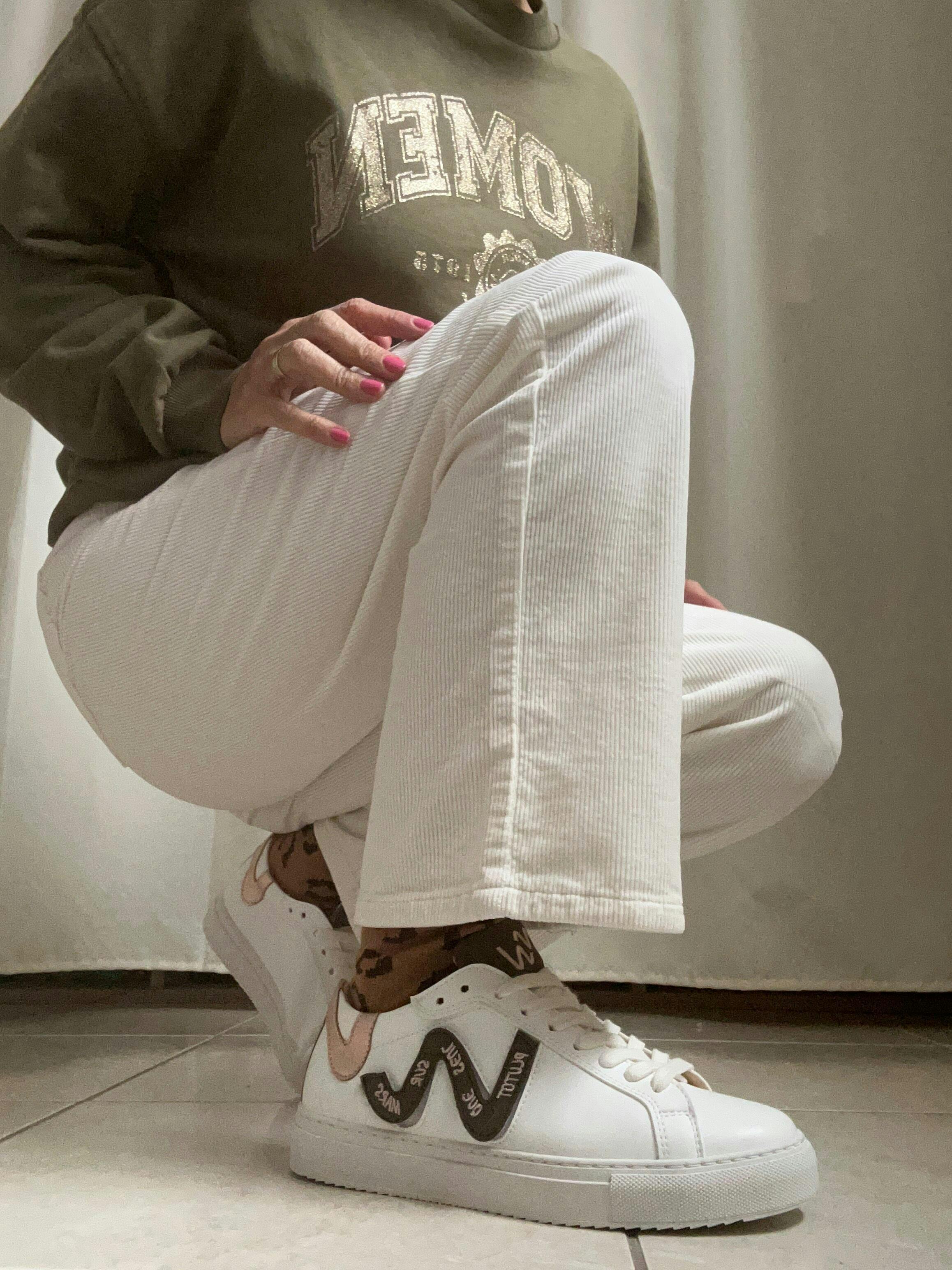 Nos baskets éco responsables peuvent s’accorder avec différents styles et vêtements : jupes, jeans, pantalons de tailleurs etc. La base blanche permet d’avoir un style raffiné et passe-partout. Nous avons opté pour une forme de basket intemporelle avec des twists tendance pour qu’elles conviennent à toutes les générations.